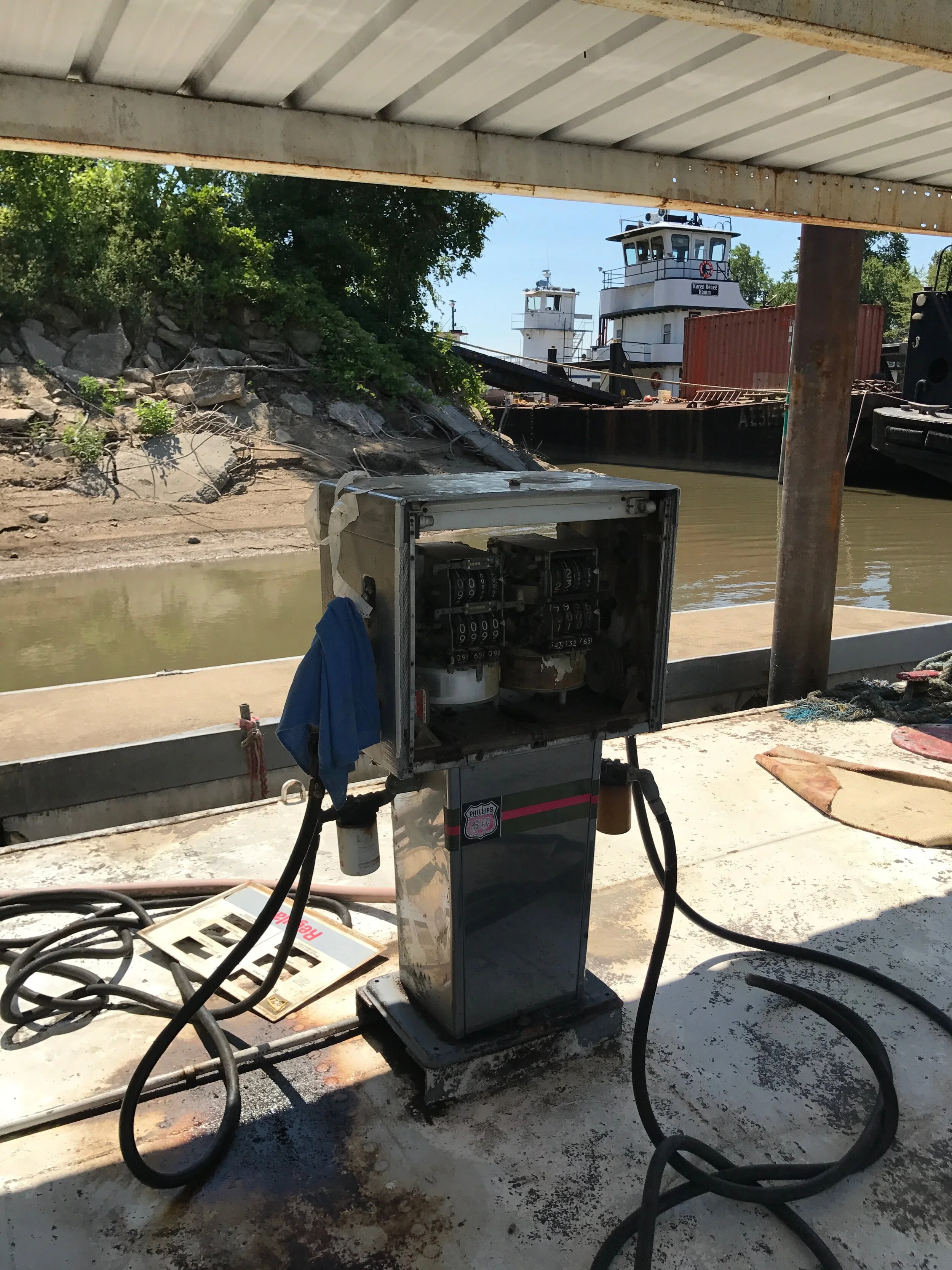 Lat start today. Needed to chane fuel filters. Dick Hamms thought that was the issue. Dock worker helped out. Changed all 6 filters, 2 rear, 4 front. Rear were clogged. Engines running smoother today. No RPM drops. First day in Mississippi River. The river is about 2.5 times the width of the Illinois River. Depth is greater, 30-50 feet. Much more tug traffic starting as we pass St Louis. Larger tug (5x6, 2 tug push). Seeing more industry again around St Louis. More current through here. Gained about 3 knotts. Hills getting taller, cliffs seen. Barges keep getting larger (6x7). Just outside of St Louis, see two men in a canoe. First met them at Grafton Harbor. They were decked out with camping gear. They asked where we were heading, then they said they were also heading in the same direction, down the Mississippi to New Orleans. Come into St Louis. Pass by the arch. Oil refinery, quary on side of river. Stopped for fuel at Hoppies Marire Services, mile 158. This dock was created by stringing togetherabout 15 small old barges. Diesel fuel should be crystal clear if it is pure. Most diesel is colored though. Pink diesel mostly, has a die in it. The light green diesel might have algaeside in it. Before St Louis, passed through 2 locks, both only went down 4 feet, floated through both. Quickest locks, made great time. This was the firstday weve driven from the cabin. Isolated rainstorms. Tied up on the outer wall of Kaskaskia lock for the night.